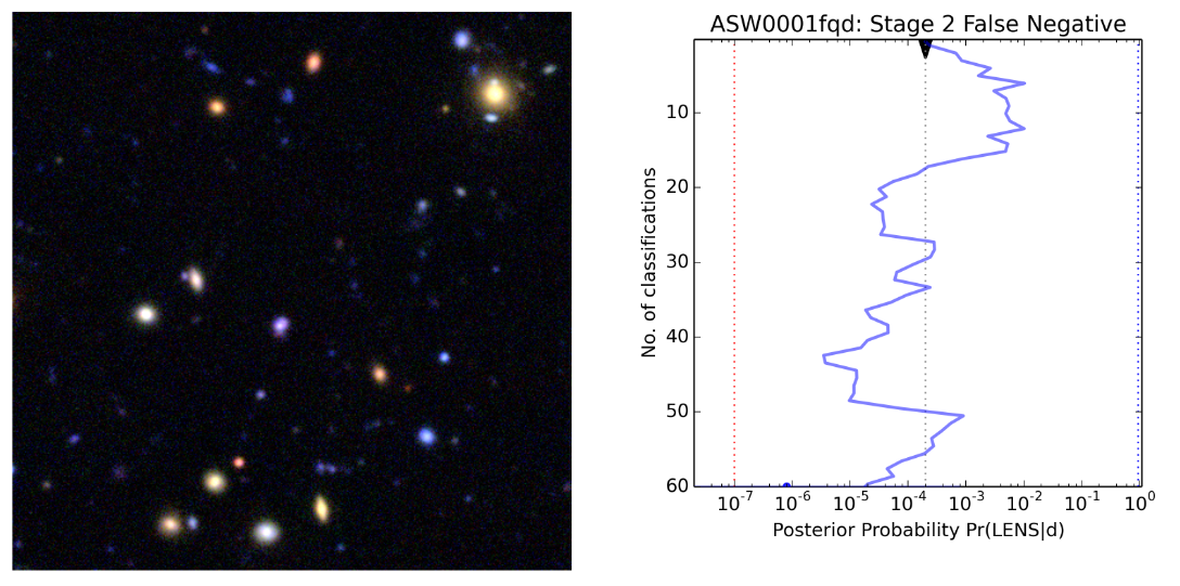 The image on the left shows a training image used in Space Warps. We inserted a simulated lens (top right) and this was presented as part of the classification stream. The right panel shows how it was classified by each viewer, the number of views increases from top to bottom. Each kink in the blue line indicates each new classification. Moves to the left indicate those who thought there was no lens here, and moves to the right show those who did. Overall the source stayed roughly 50:50, so the community classification for this object was undecided. A community classified lens candidate would lie to the right of this plot (trajectory crossing the blue dotted line on the right), and an image containing no lens candidate would cross the red dotted line on the left. Similarly, real (non-training/non-simulated) lenses may have been undecided in the CFHTLS search. We are now asking you to view some more images that could contain potential lens candidates that didn’t quite meet our detection threshold in the initial search.