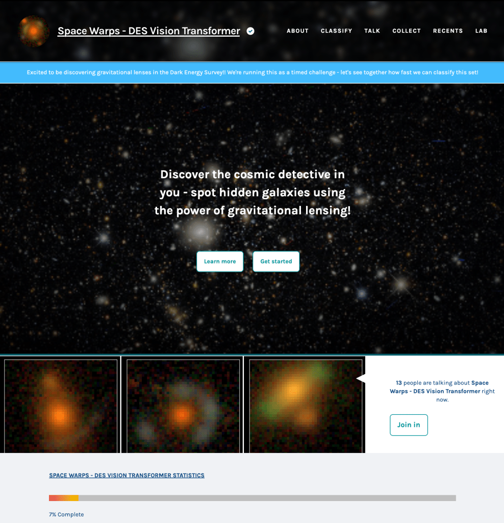 Jimena Gonzalez Lozano has been hunting for lenses in the wide area Dark Energy Survey using a machine learning code called Vision Transformer. But because there are lots of things in the Universe that can mimic strong lenses, and because it’s hard to get lots of example strong lenses to train the machine learning codes, it’s still very hard to find strong lens candidates. This is where you come in, we’d love for your to take a look at the data and find some lenses. All you need to do is look at the images presented, click if you think it’s a lens otherwise press done. In just a few minutes you can contribute significantly to identifying the most probable lens candidates. And if you are worried about getting it wrong, please don’t be – we average many classifications before we accept or reject a candidate. We’ve only been running a short time but you (as the crowd) are already finding some previously undiscovered systems. If you have a spare few minutes, please give us a hand at spacewarps.org … Every click counts!!!!